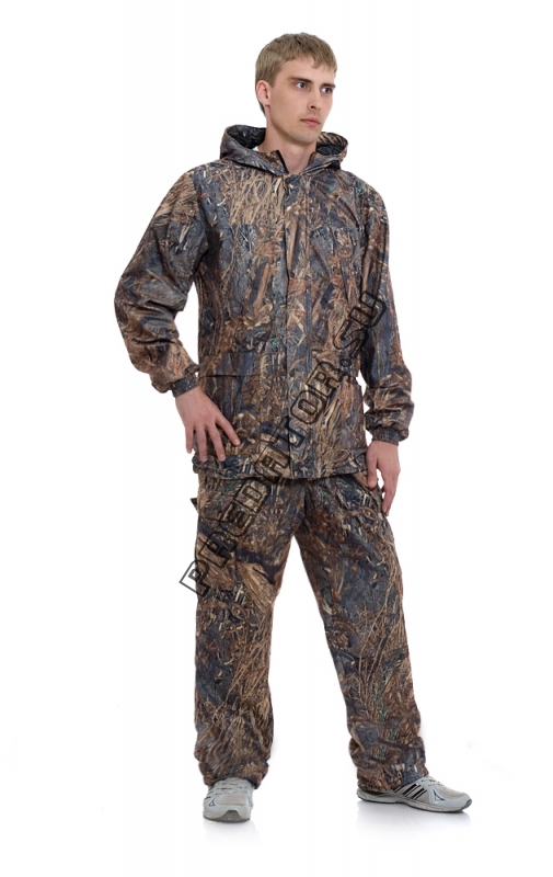 Модель выполнена из современной ткани с мембранным покрытием. Костюм прекрасно подойдет как охотникам и рыболовам, так и любителям пеших прогулок по лесу. Куртка с застежкой на молнию, закрытую ветрозащитной планкой. По низу куртки стяжка на резиновый шнур со стопорами. Низ рукавов на манжетах с резинкой. По нижнему шву рукава на уровне проймы и на спинке располагаются вентиляционные отверстия. Брюки на поясе с резинкой и шнуром. Низ брюк со стяжкой на резиновый шнур со стопорами.