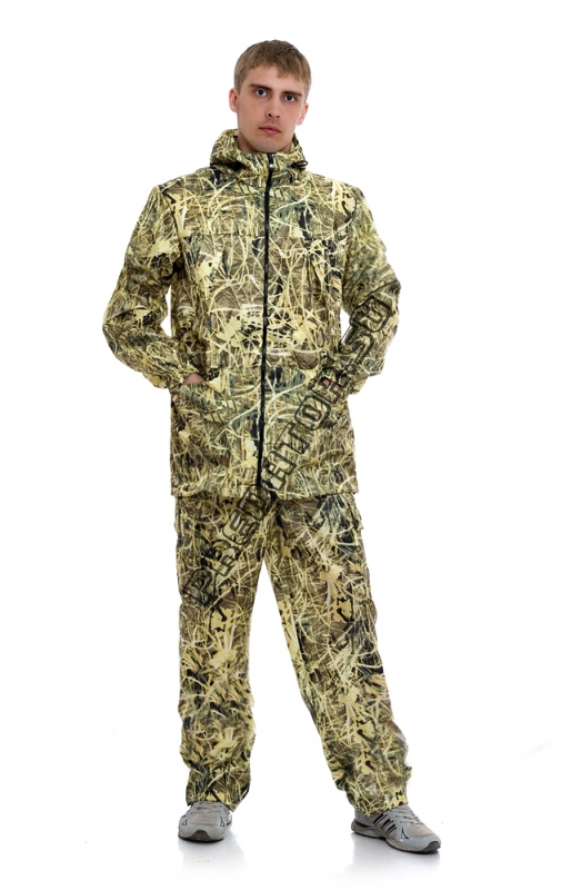 Превосходный костюм для отдыха в непогоду. Влагонепроницаем. На куртке 4 кармана, которые закрыты клапанами от попадания влаги. Куртка с застежкой на молнию. По низу куртки стяжка на резиновый шнур со стопорами. Низ рукавов на манжетах с резинкой. На спинке и по нижнему шву рукавов расположены вентиляционные отверстия. Брюки на поясе с резинкой и шнуром. Низ брюк со стяжкой на резиновый шнур со стопорами. Ткань: Оксфорд